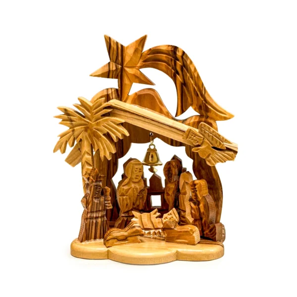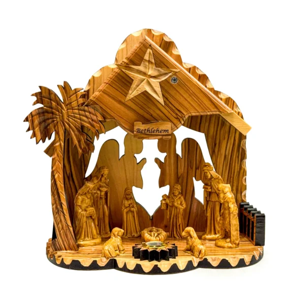 Szopka Bożonarodzeniowa na tle Aniołów z drewna oliwnego z pozytywką