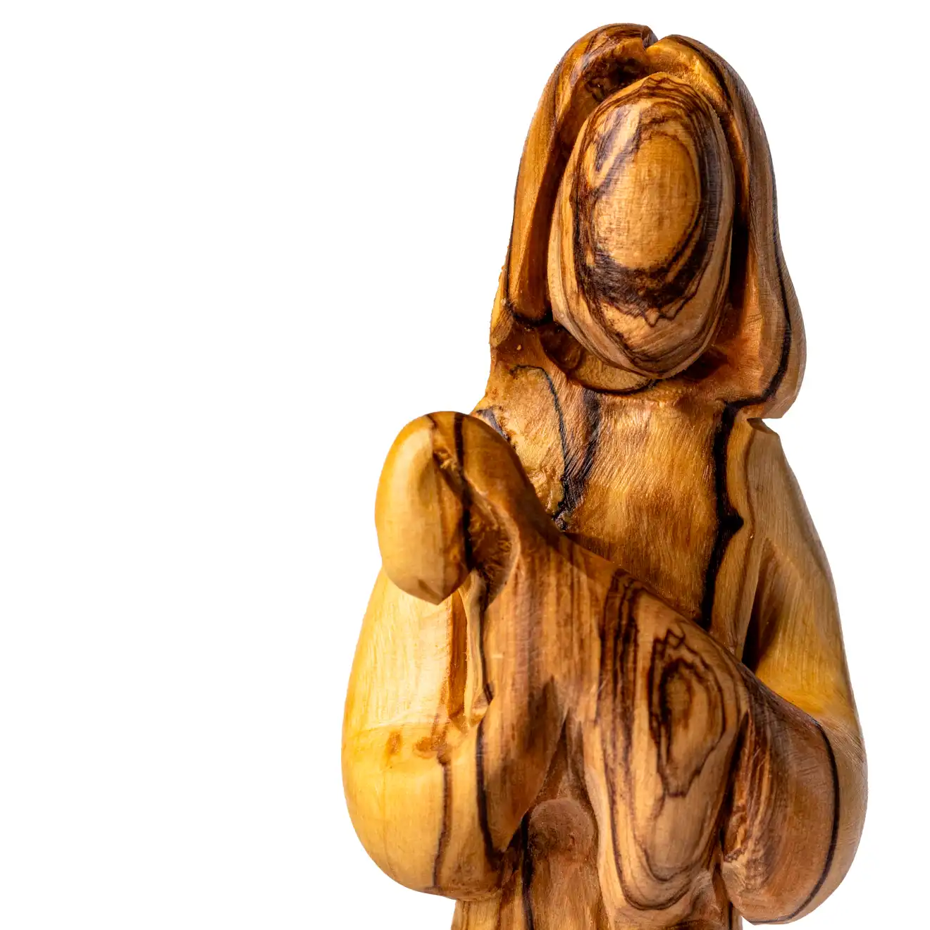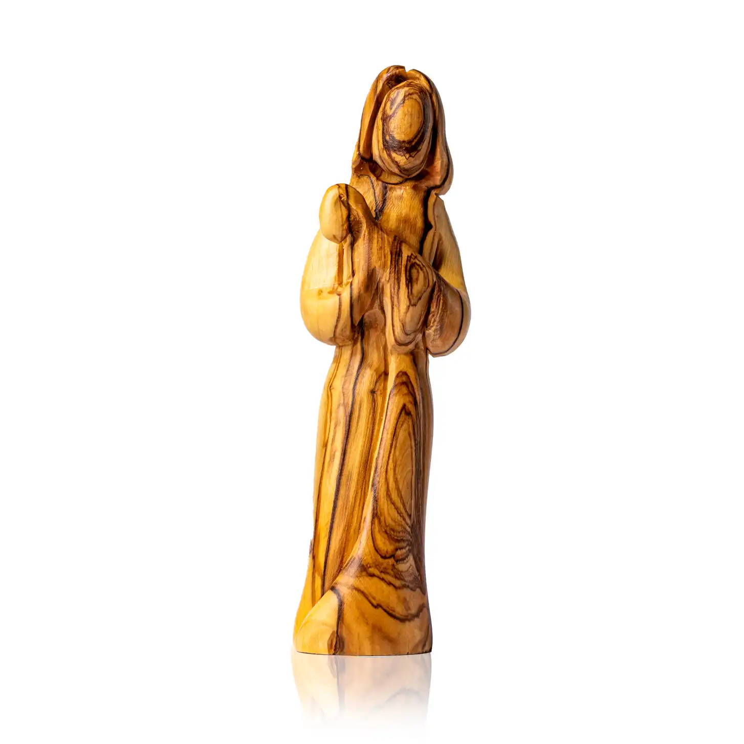 Ta wyjątkowa figurka przedstawia pasterza trzymającego owieczkę, ręcznie wyrzeźbioną z drewna oliwnego, prosto z serca Betlejem. Wysokość 16 cm tej rzeźby przyciąga uwagę swoją detalami i wyraża głębokie przesłanie opieki i miłości, które są uniwersalne dla wszystkich kultur i wierzeń.