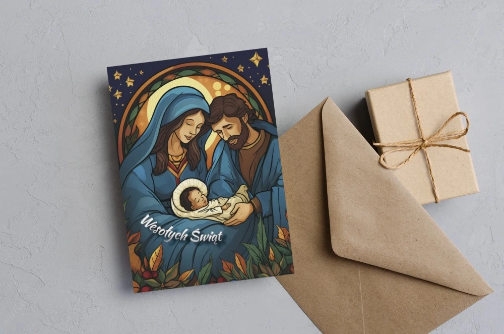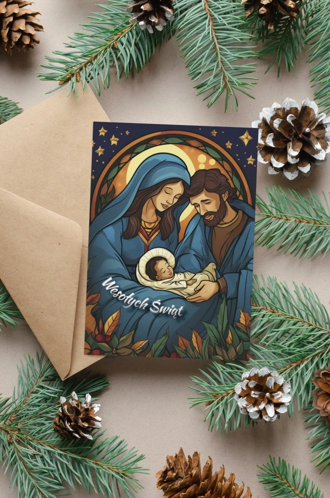 Urokliwy wizerunek Świętej Rodziny otoczonej gwiazdami. Kartka nawiązuje do magii Betlejem i nocy Narodzenia Pańskiego. Idealny wybór na przekazanie bożonarodzeniowych życzeń.
