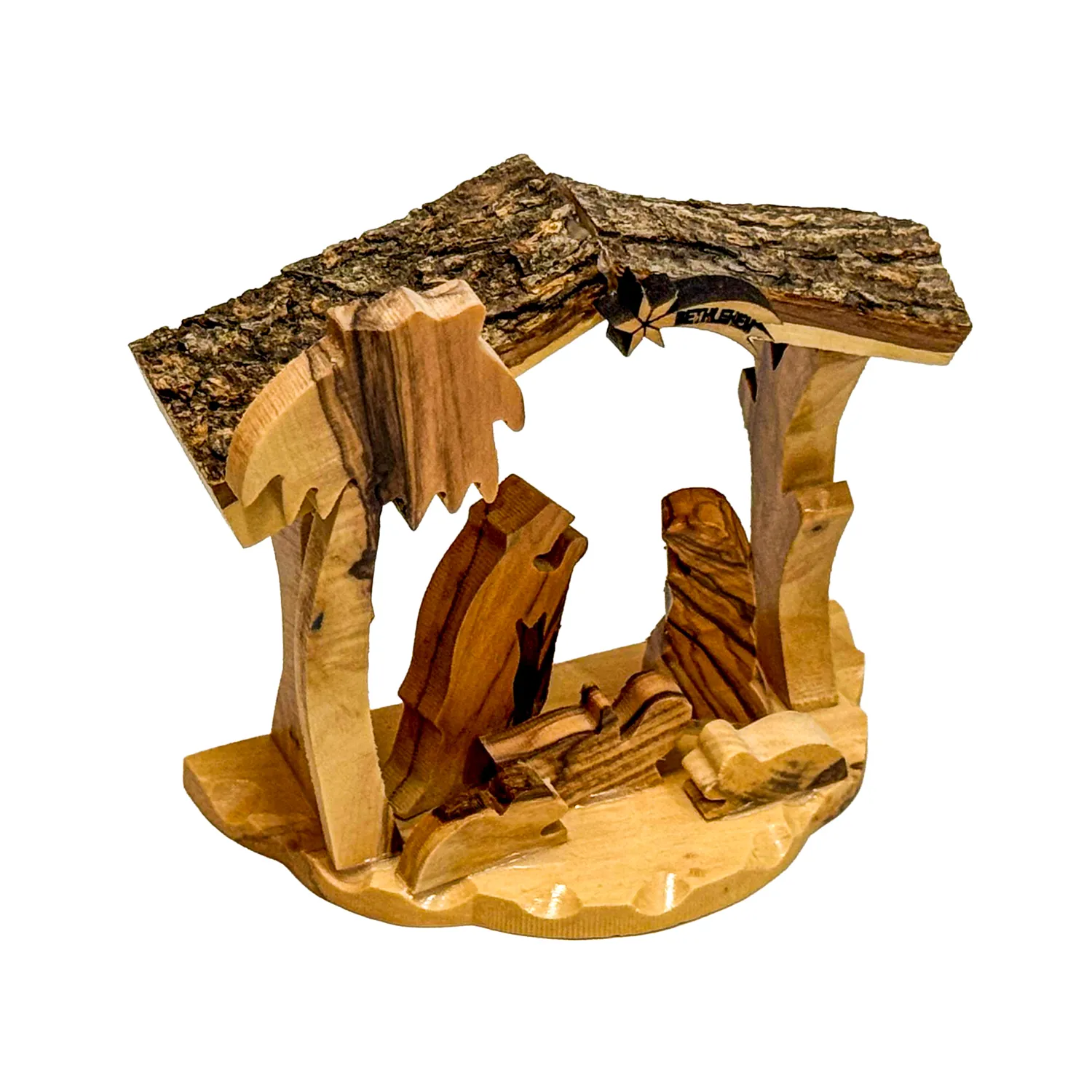 Ręcznie wykonana mała szopka bożonarodzeniowa z drewna oliwnego z fragmentem naturalnej kory. Unikalne połączenie prostoty, natury i duchowości rodem z Betlejem.