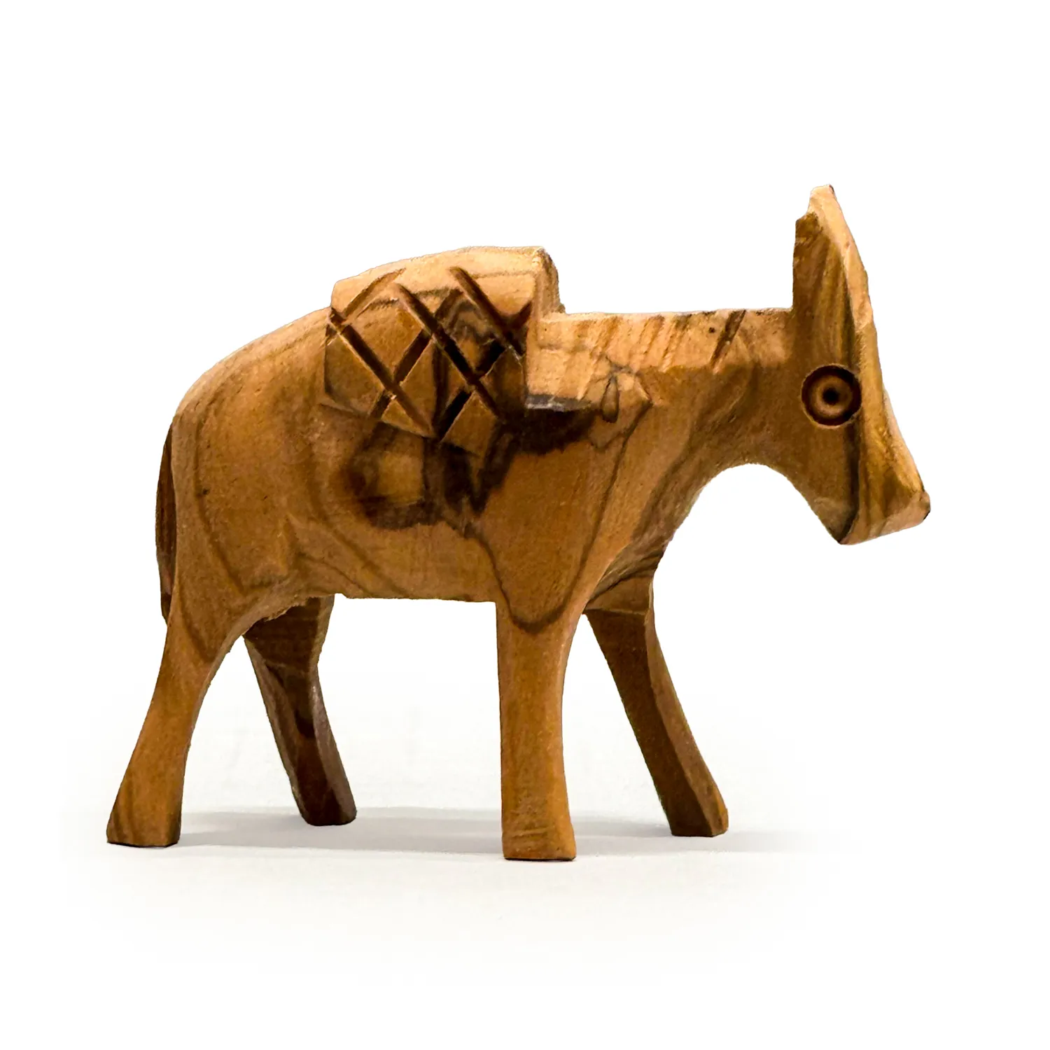 Ręcznie rzeźbiony osiołek z drewna oliwnego z Betlejem. Symbol pokory i wierności, wykonany przez lokalnych chrześcijańskich rzemieślników. Idealny jako ozdoba lub element szopki.