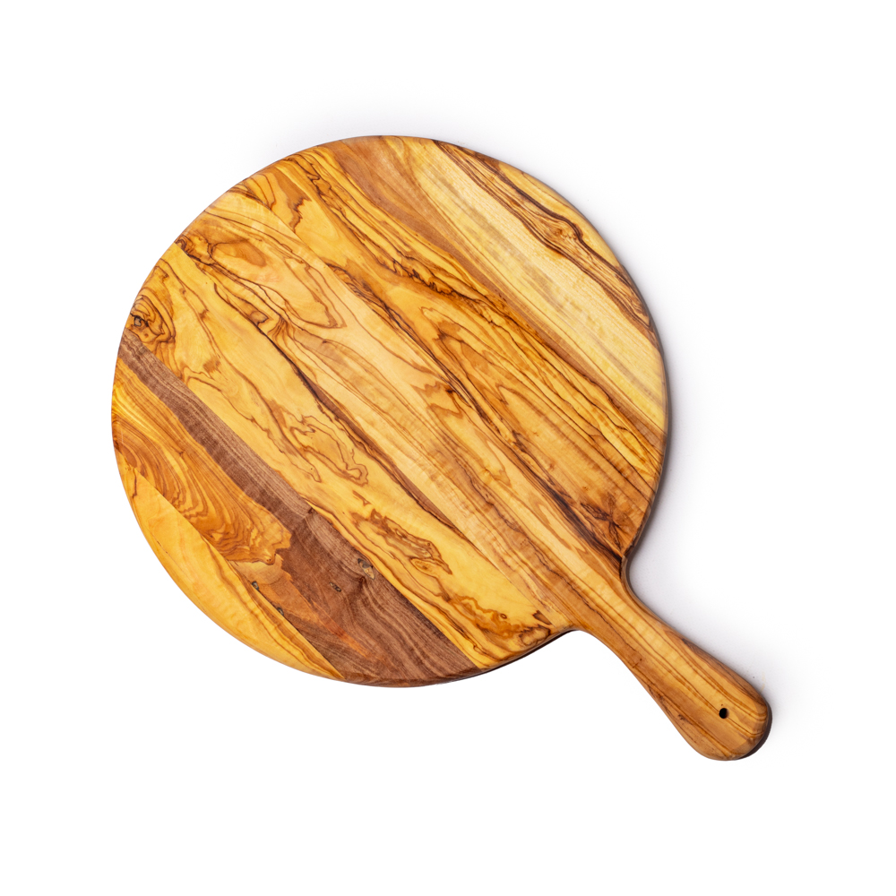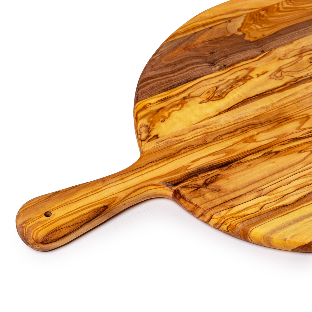 Dodaj do swojej kuchni styl i funkcjonalność dzięki okrągłej desce z drewna oliwnego z rączką – idealnej do krojenia, serwowania i dekoracji!