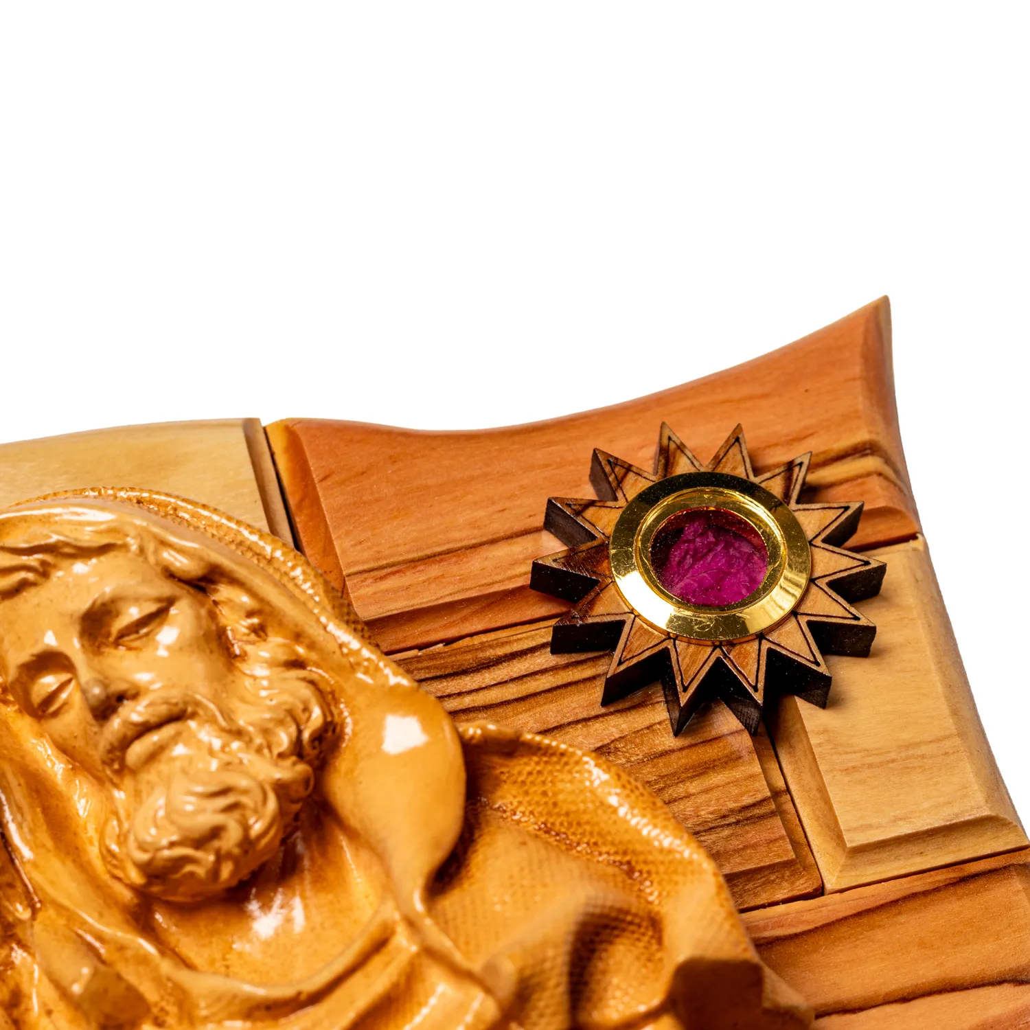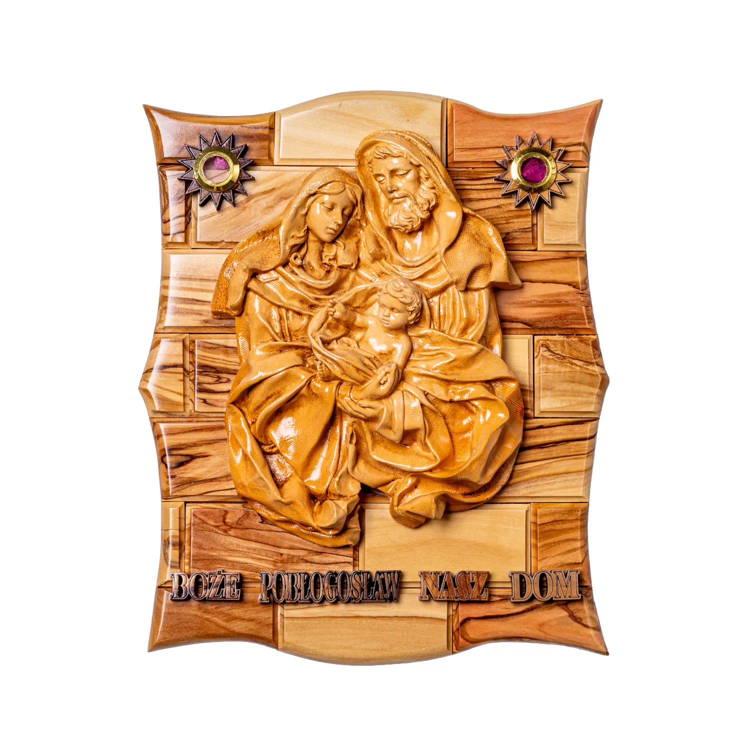 Piękna płaskorzeźba przedstawiająca Świętą Rodzinę — postacie wykonane z masy gipsowej, osadzone na solidnej podstawie z drewna oliwnego. Ozdobiona relikwiami z Ziemi Świętej oraz napisem „Boże Błogosław Nasz Dom”. Idealna do powieszenia w domu lub kaplicy.