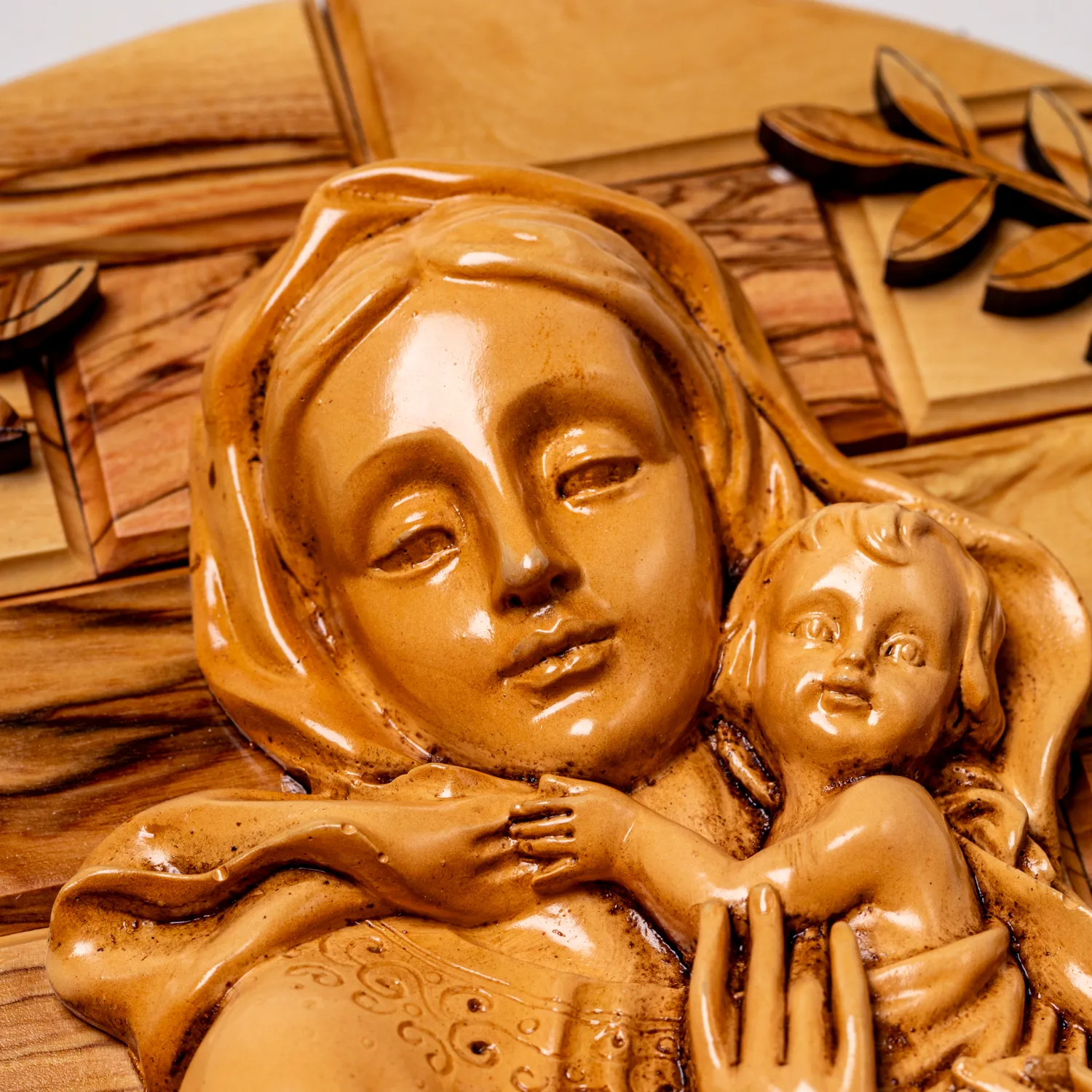 Prezentujemy płaskorzeźbę z Maryją i Dzieciątkiem, ukazującą czułość i miłość Matki Bożej obejmującej Jezusa. Postacie zostały starannie wykonane z masy gipsowej, osadzone na pięknej podstawie z naturalnego drewna oliwnego.