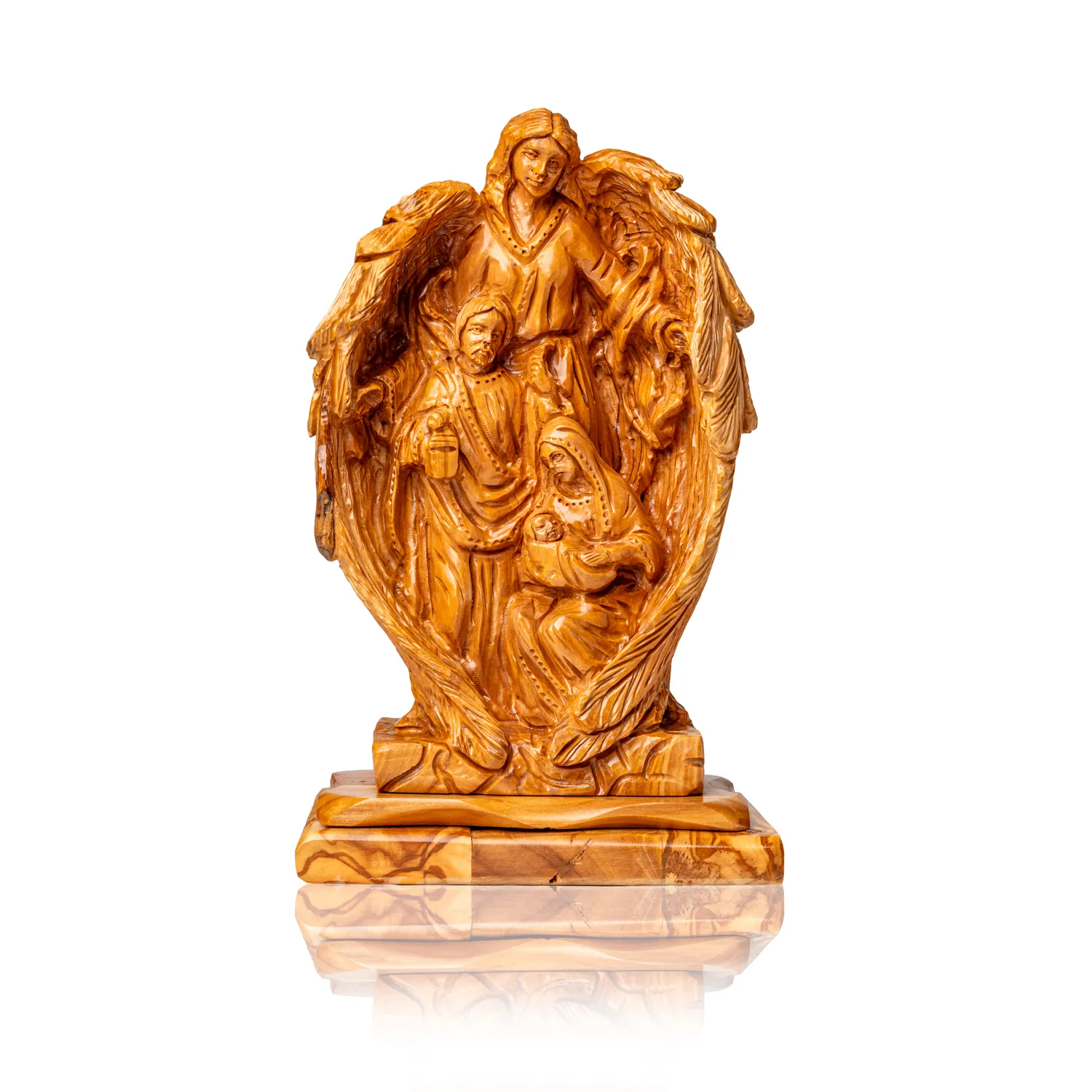 Święta Rodzina pod Skrzydłami Anioła – Rzeźba z Drewna Oliwnego