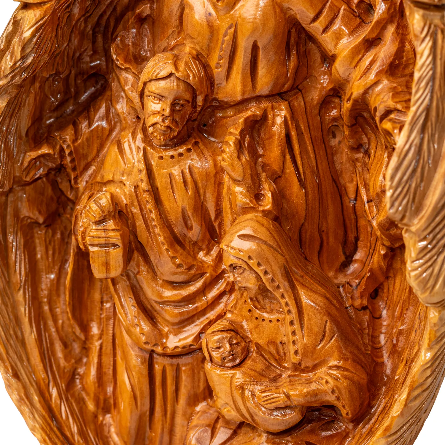 Rzeźba powstała w warsztatach betlejemskich artystów, którzy od pokoleń tworzą dzieła z drewna oliwnego. Każdy egzemplarz jest unikalny – różni się układem słojów i odcieniem drewna, co czyni go niepowtarzalnym świadectwem wiary i tradycji.