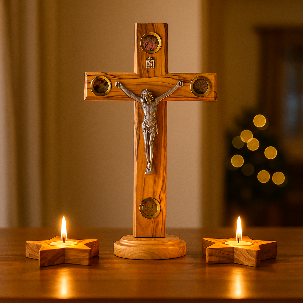 - Stojący krzyż z drewna oliwnego (ok. 19 cm) – zawiera cztery autentyczne relikwie Ziemi Świętej umieszczone za szkiełkami: kadzidło, ziemię z Jerozolimy, listek oliwny i fragment skały z Betlejem.