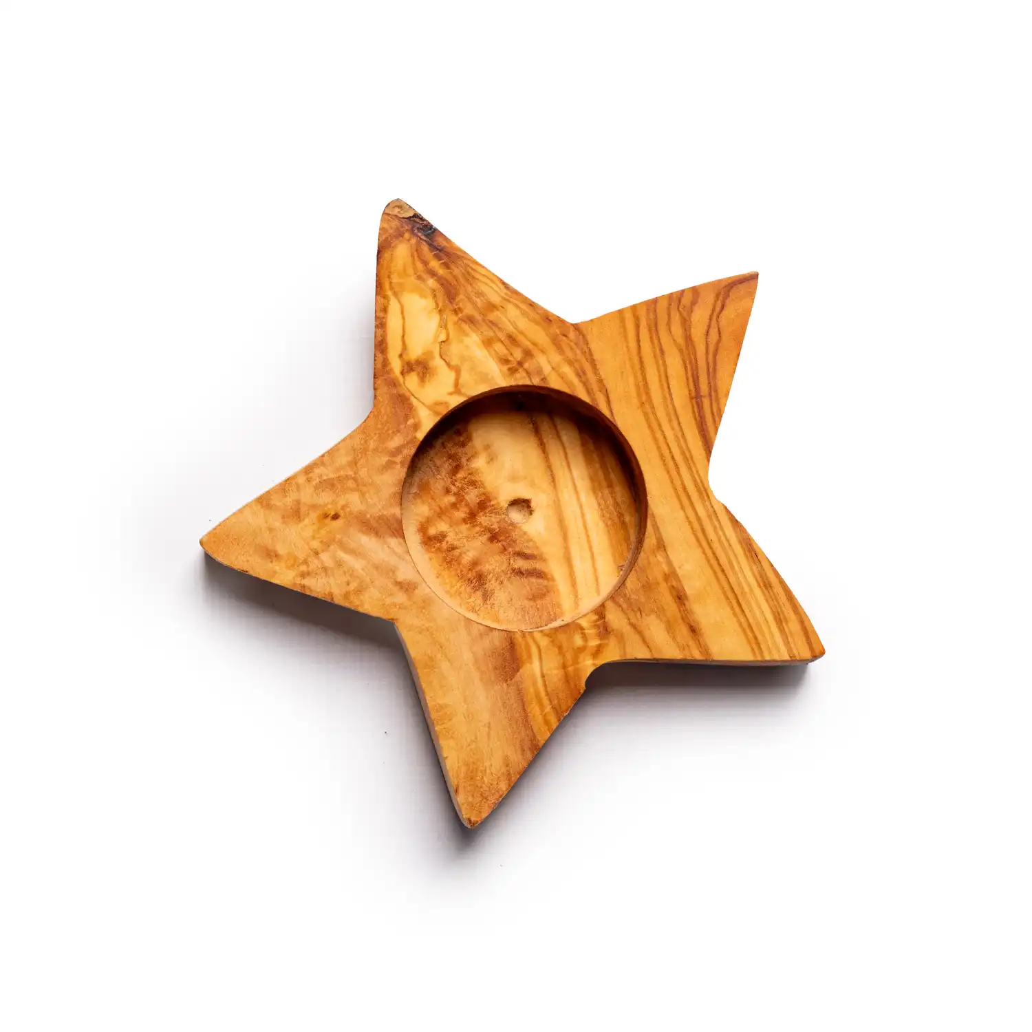 - Dwa świeczniki w kształcie gwiazdy – symbolizują Gwiazdę Betlejemską, prowadzącą do narodzin Zbawiciela. Każdy świecznik został wykonany z tego samego drewna oliwnego, co krzyż, dzięki czemu cały zestaw tworzy spójną kompozycję.